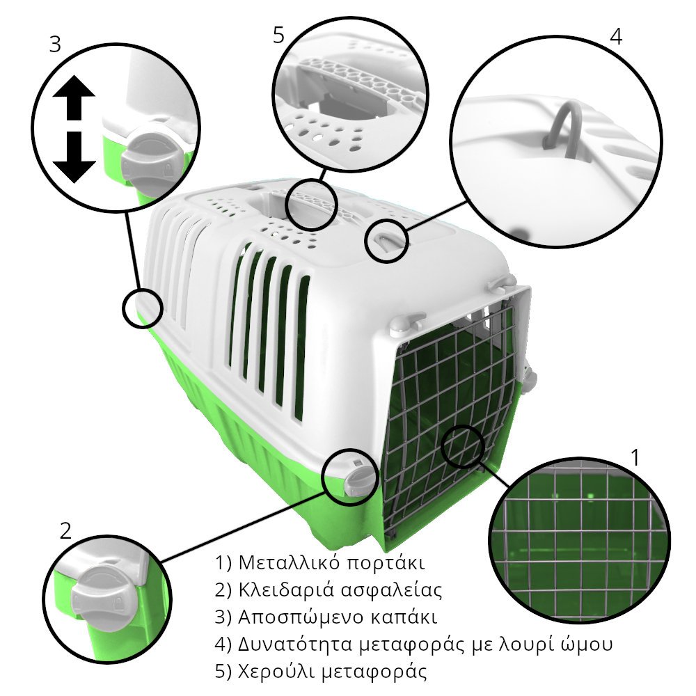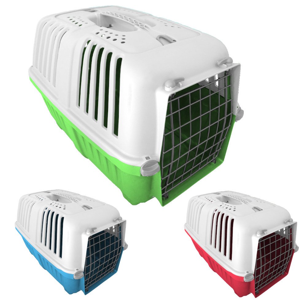 Ένα κλουβάκι μεταφοράς με μεταλλικό πορτάκι, για σκύλους και γάτες που έχει κατοχυρωθεί διεθνώς.
