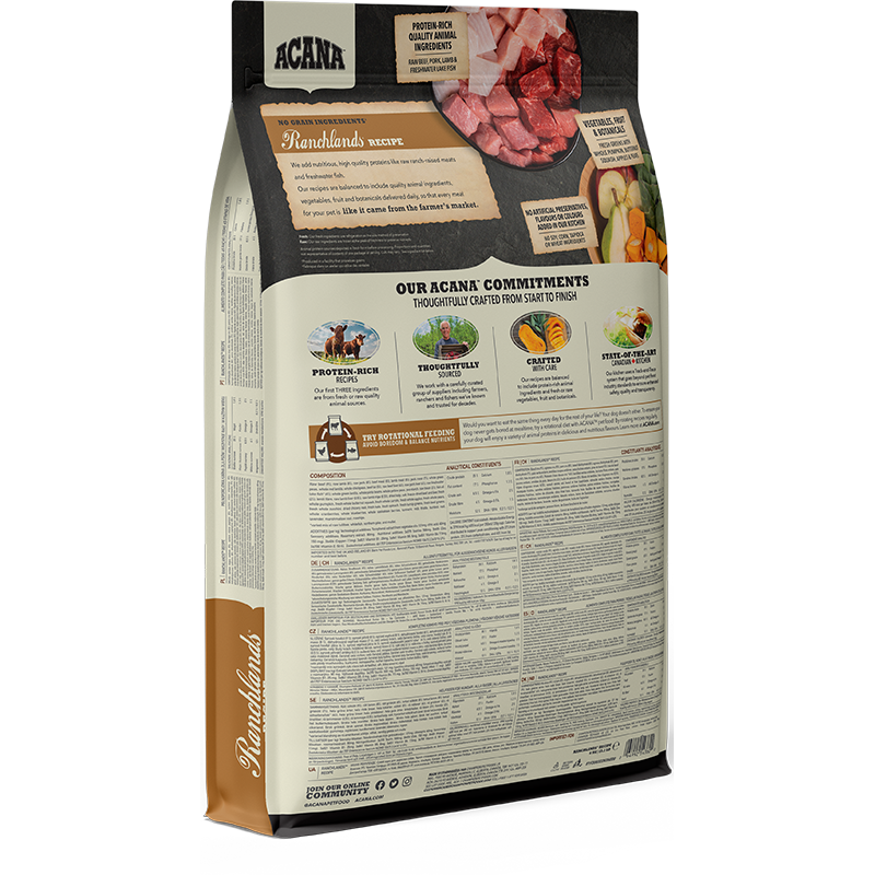 Η ACANA Ranchlands ξεχειλίζει από ωμά κρέατα και ψάρια του γλυκού νερού. Για να αντικατοπτρίζει τη διατροφή που θα προσέφερε και η Μητέρα Φύση στον σκύλο σας, αυτή η συνταγή περιλαμβάνει ολόκληρα ζωικά συστατικά, όπως κρέας, ψάρι, όργανα και κόκκαλο. Έτσι ο σκύλος σας λαμβάνει ότι χρειάζεται για να παραμένει ευτυχισμένος, υγιής και δυνατός.