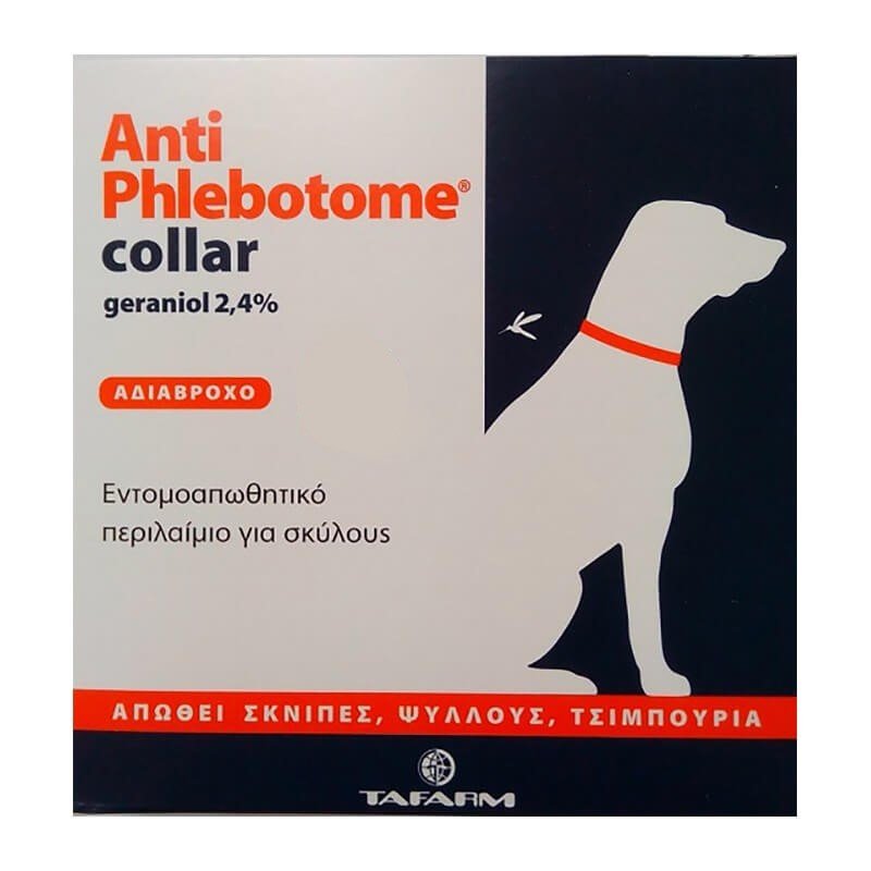 Το ANTIPHLEBOTOME collar, είναι ένα απωθητικό περιλαίμιο για σκύλους που περιέχει geraniol 2.4%.