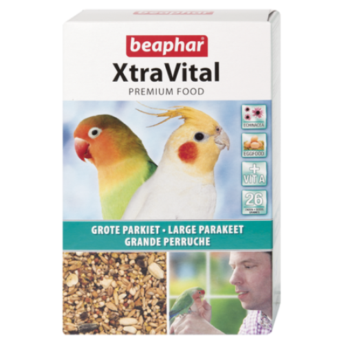 H XtraVital Large Parakeet Food είναι νόστιμη και ισορροπημένη τροφή η οποία παράχθηκε σε συνεργασία με ειδικούς διατροφολόγους, κτηνιάτρους και ειδικούς σε πτηνά. Η XtraVital συνδυάζει φρούτα, μεγάλη ποικιλία επιλεγμένων σπόρων και συμπλήρωμα αυγών ώστε να δημιουργηθεί μία πλήρης τροφή η οποία δίνει σωστή καθημερινή και θρεπτική ισορροπία, που συστήνεται για τους μεγάλους παπαγάλους. Το XtraVital περιέχει Echinacea, ένα εκχύλισμα που διατηρεί ένα υγιές ανοσοποιητικό σύστημα, ενθαρρύνει την ταχεία αποκατάσταση μετά από την ασθένεια και ενισχύει το πτέρωμα και γενικά την καλή κατάσταση σε όλα τα πτηνά. Η αλλαγή από την υπάρχουσα τροφή σε XtraVital δεν απαιτεί περίοδο προσαρμογής.