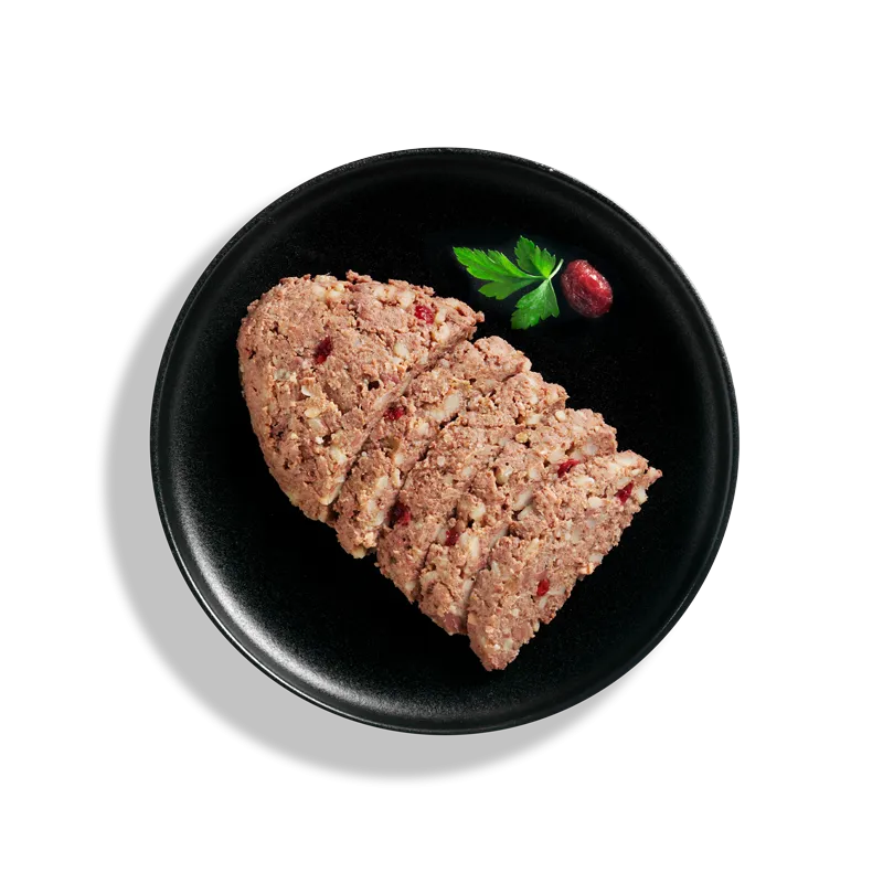 Σύνθεση: Καρδιά πάπιας, συκώτι (34 %), Αρνίσιο κρέας, συκώτι, πατσάς, πνεύμονας, καρδιά (31 %), Ζωμός πάπιας & αρνιού (27,5 %), Ρύζι μαγειρεμένο (4 %), Άγρια βατόμουρα lingoberry (2 %), Κενταύριο έλαιο (0,5 %), Αποξηραμένα κελύφη αβγών (0,5 %), Μεταλλικές ουσίες (0,5 %).