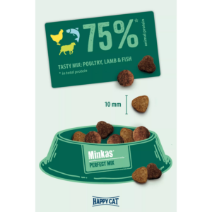 Το Happy Cat Minkas Perfect Mix μας είναι μια ιδιαίτερα καλά ισορροπημένη πλήρης τροφή για ενήλικες γάτες. Με νόστιμα πουλερικά, εκλεκτό αρνί και νόστιμο ψάρι, αυτή η ξηρή τροφή προσθέτει ενθουσιασμό στη διατροφή της γάτας σας. Το νόστιμο μείγμα κροκέτας είναι καλά αποδεκτό και καλά ανεκτό. Η συνταγή μας, με την υψηλή αναλογία ζωικής πρωτεΐνης υψηλής αξίας, είναι 100% φυσική και ισορροπημένη. Αυτή η νόστιμη ξηρή τροφή έχει πολλές βιταμίνες και μέταλλα και υποστηρίζει το ανοσοποιητικό σύστημα. Οι συνταγές μας είναι φυσικά απαλλαγμένες από τεχνητά αρώματα και συντηρητικά.