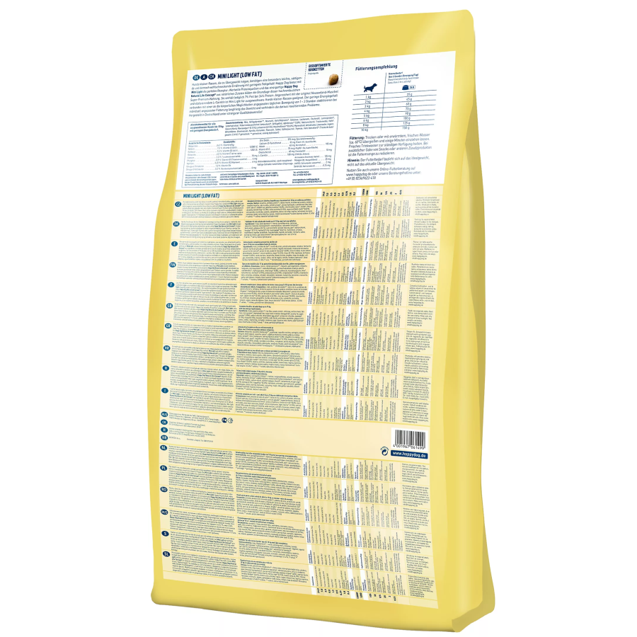 Το Happy Dog Mini Light Low Fat είναι τέλεια προσαρμοσμένο στις απαιτήσεις μικρών σκύλων έως 10 κιλών, που χρειάζονται διατροφή με χαμηλά λιπαρά για να διατηρήσουν μια καλή φυσική κατάσταση ή να διατηρήσουν το σωματικό βάρος, π.χ. σύμφωνα με ειδική δίαιτα. Η νόστιμη πλήρης τροφή χωρίς γλουτένη, με μόνο 7% λιπαρά και L-Καρνιτίνη για το μεταβολισμό, βασίζεται στο μοναδικό Happy Dog Natural Life Concept® και είναι ιδιαίτερα χορταστική λόγω του υψηλού ποσοστού φυτικών ινών.