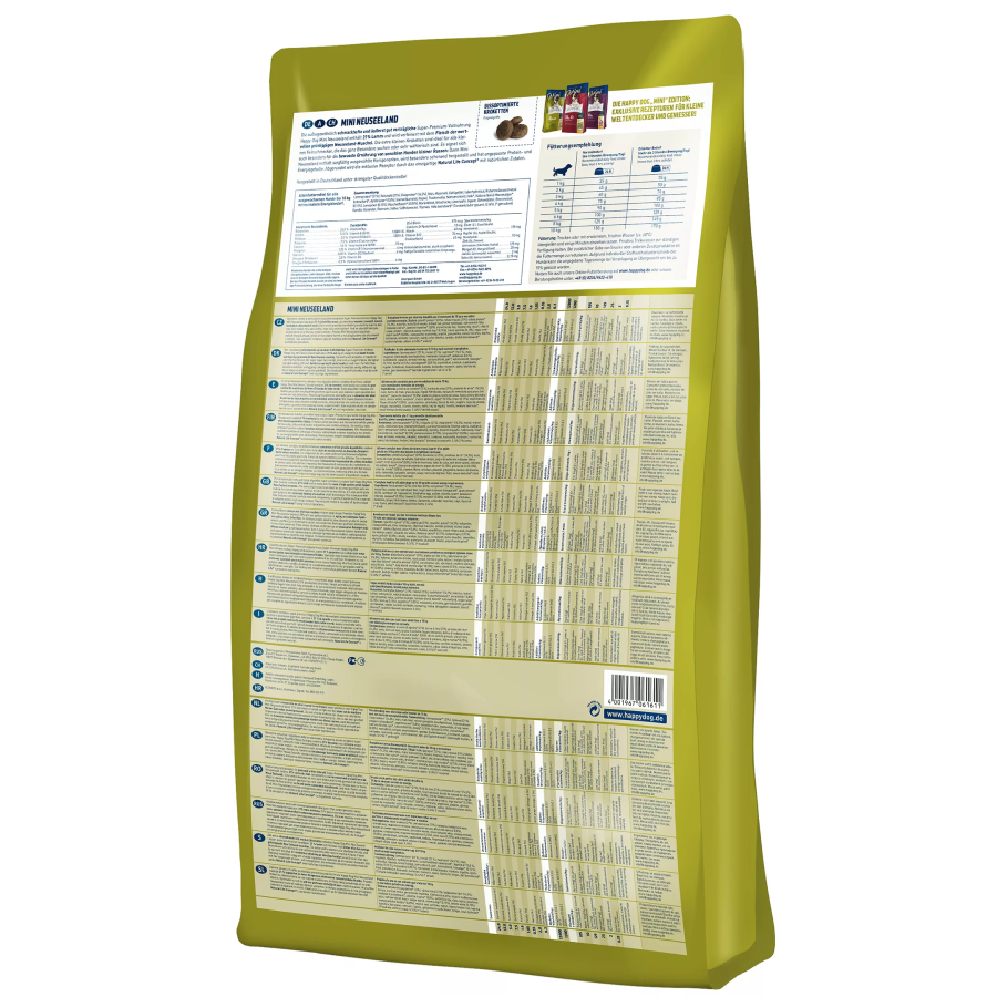 Περιποιηθείτε τον τετράποδο φίλο σας με την υγιεινή ξηρή τροφή μας, το Happy Dog Mini New Zealand. Μια πραγματική απόλαυση, με εύκολα εύπεπτο αρνί και μια συνταγή χωρίς γλουτένη που το κάνει ιδιαίτερα εύκολο στο στομάχι και τα έντερα. Τα προσεκτικά επιλεγμένα, αποκλειστικά φυσικά συστατικά κάνουν το προϊόν καλά ανεκτό και προσθέτουν υπέροχη γεύση στο κατοικίδιο ζώο σας. Βασισμένα στο μοναδικό Happy Dog Natural Life Concept®, τα μύδια Νέας Ζηλανδίας υποστηρίζουν τις αρθρώσεις και τα πολύτιμα ωμέγα-3 και ωμέγα-6 λιπαρά οξέα εξασφαλίζουν ένα γυαλιστερό τρίχωμα. Το εξαιρετικά νόστιμο Happy Dog Mini New Zealand super premium all-in-one τροφή είναι ιδανικό για όλους τους δύσκολους ενήλικους γκουρμέ σκύλους έως 10 κιλά, που χρειάζονται κάποια ποικιλία ή έχουν ευαίσθητο στομάχι. Οι πολύ μικρές κροκέτες είναι ιδανικές για τα δόντια σκύλων μικρόσωμων ράτσας.