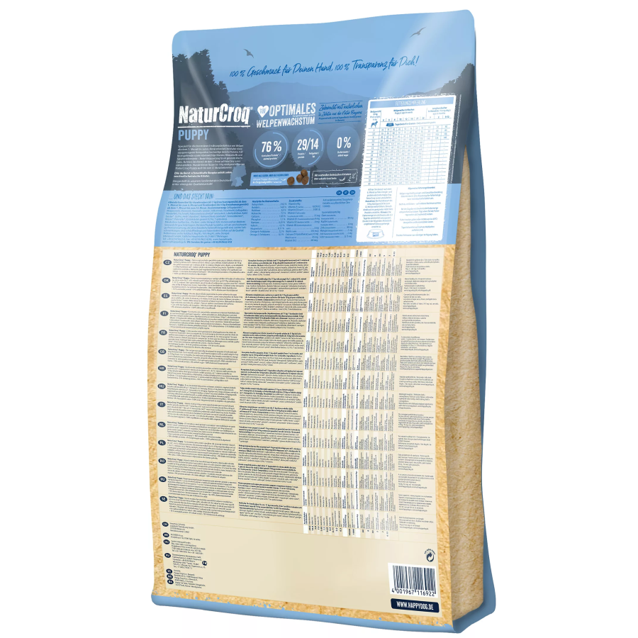 Η βέλτιστη περιεκτικότητα σε λιπαρά και πρωτεΐνες του Happy Dog NaturCroq Puppy παρέχει την τέλεια υποστήριξη στα κουτάβια τους πρώτους μήνες υψηλής ανάπτυξης και εξασφαλίζει υγιή, αρμονική ανάπτυξη. Μια ισορροπημένη διατροφή, με ζωική πρωτεΐνη υψηλής αξίας, τοπικά καλλιεργούμενα δημητριακά ολικής αλέσεως και βασικές βιταμίνες, ιχνοστοιχεία και μέταλλα, είναι ζωτικής σημασίας για τη διασφάλιση της βέλτιστης ανάπτυξης του κουταβιού σας. Το ασβέστιο και η βιταμίνη D3 παίζουν μεγάλο ρόλο στην ανάπτυξη της δύναμης του σώματος και των υγιών οστών. Τα πολύτιμα ακόρεστα λιπαρά οξέα διασφαλίζουν ότι το κουτάβι σας αναπτύσσει έναν υγιή φραγμό δέρματος και ένα γυαλιστερό τρίχωμα. Αυτή η εξαιρετικά νόστιμη σύνθεση περιέχει πολύτιμα βότανα τοπικής καλλιέργειας που παρέχουν στον τετράποδο φίλο σας πολλά σημαντικά θρεπτικά συστατικά από φυσική πηγή.