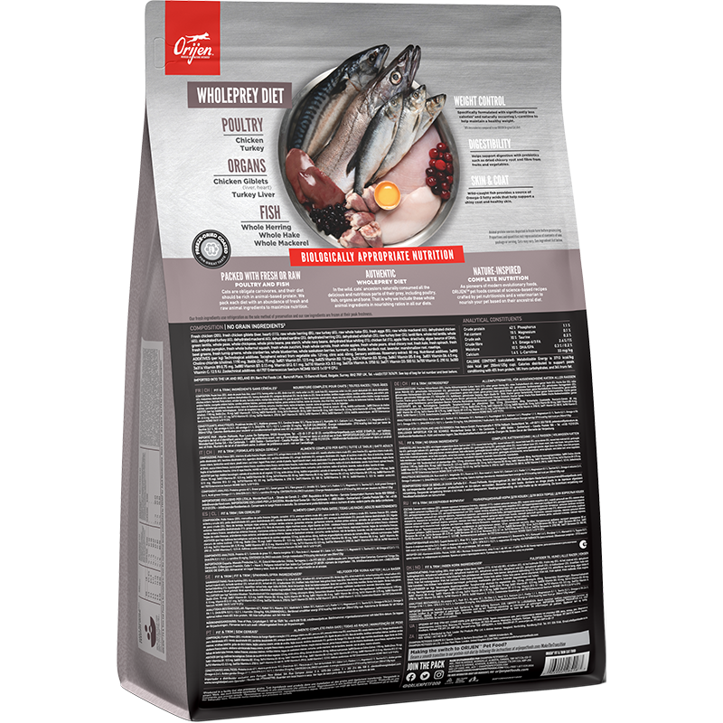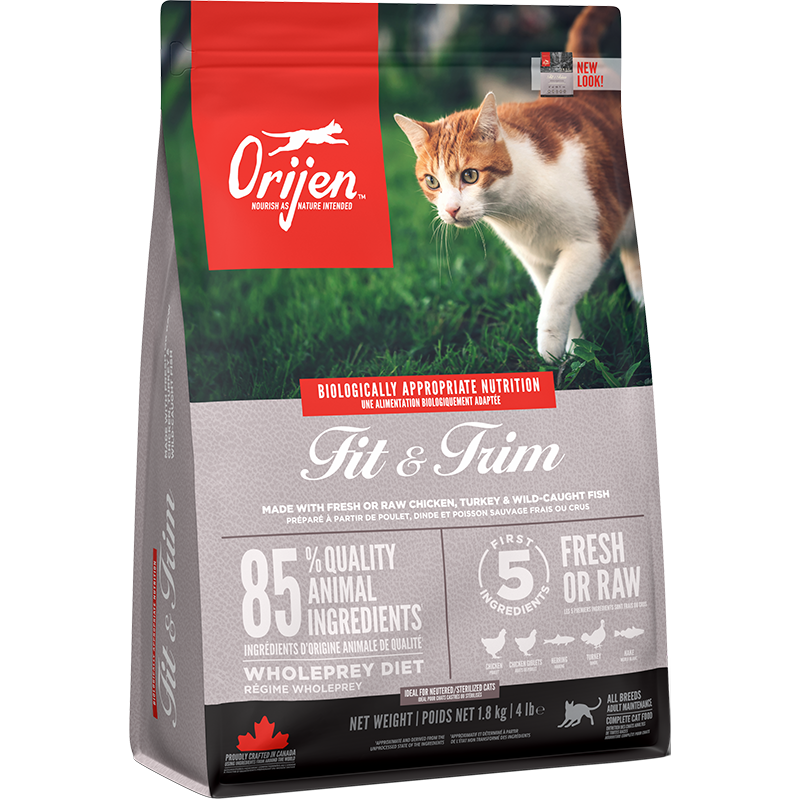 Όπως όλα τα σαρκοφάγα, έτσι και οι γάτες έχουν ανάγκη μια δίαιτα Βιολογικά Κατάλληλη και πλούσια σε πρωτεΐνη και λίπη για να ευημερούν. Η ORIJEN® Fit & Trim είναι μια συνταγή πλούσια σε ποιοτικά ζωικά συστατικά από φρέσκο ή ωμό κοτόπουλο και γαλοπούλα, αλλά και ψάρια, ειδικά σχεδιασμένη για υποστήριξη άπαχης μυϊκής μάζας και βέλτιστη φυσική κατάσταση. Χάρη στις WholePrey και γεμάτες θρεπτικά στοιχεία αναλογίες ζωικών συστατικών, η ORIJEN Fit & Trim προσφέρει στη γάτα σας μια δίαιτα απαράμιλλης ποιότητας.