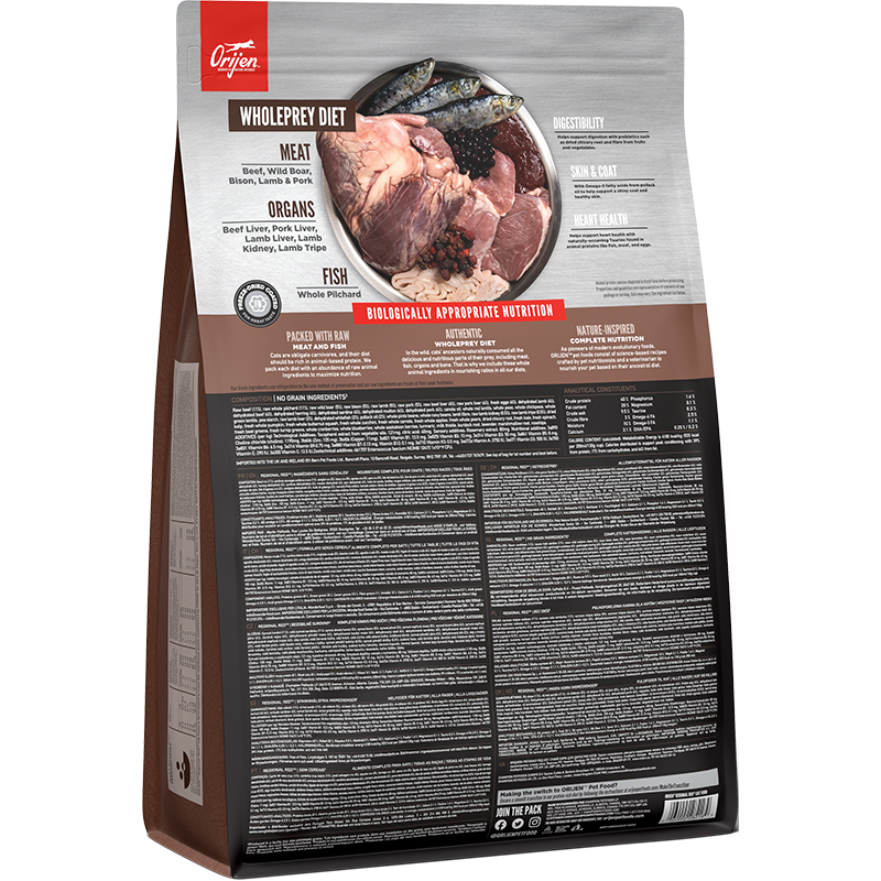 Όπως όλα τα σαρκοφάγα, έτσι και οι γάτες έχουν ανάγκη μια δίαιτα Βιολογικά Κατάλληλη και πλούσια σε πρωτεΐνη και λίπη από μια ποικιλία ζωικών συστατικών για να ευημερούν. Η ORIJEN® Regional Red είναι μια συνταγή που περιλαμβάνει ωμό βοδινό κρέας, ολόκληρη σαρδέλα, αγριόχοιρο, βίσωνα και αρνί. Πλούσια σε WholePrey αναλογίες ζωικών συστατικών και γεμάτη θρεπτικά στοιχεία, η ORIJEN® Regional Red προσφέρει στη γάτα σας μια δίαιτα απαράμιλλης ποιότητας.
