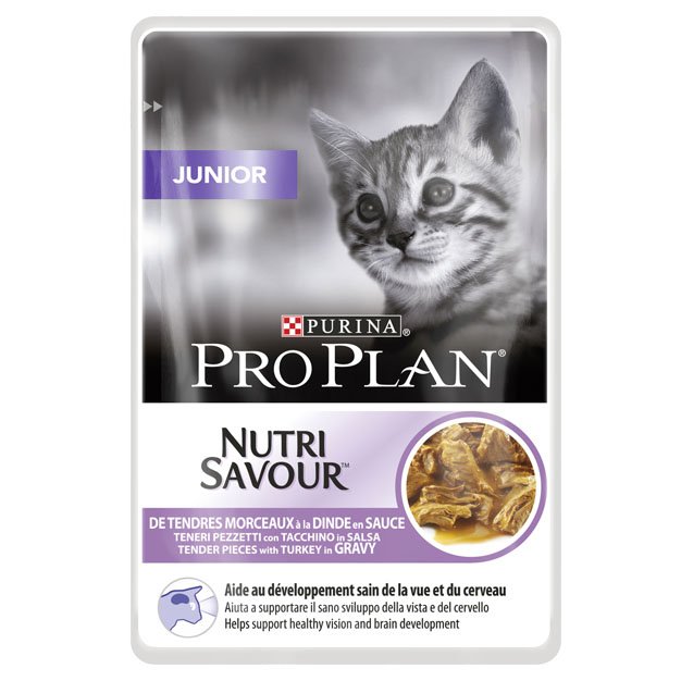 H PRO PLAN περιέχει συγκεκριμένους συνδυασμούς συστατικών, επιστημονικά σχεδιασμένους για να επηρεάσουν την μακρόχρονη υγεία της γάτας. Η PRO PLAN JUNIOR NUTRI SAVOUR είναι μία πλήρης τροφή για γατάκια με τρυφερά κομματάκια με γαλοπούλα σε σάλτσα.