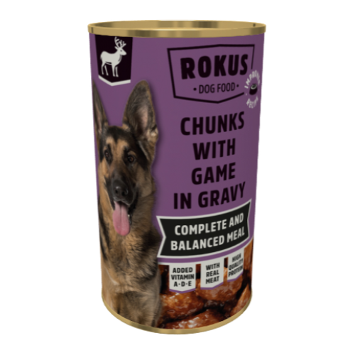 Πλήρης ζωοτροφή για σκύλους σε κομματάκια με κυνήγι.