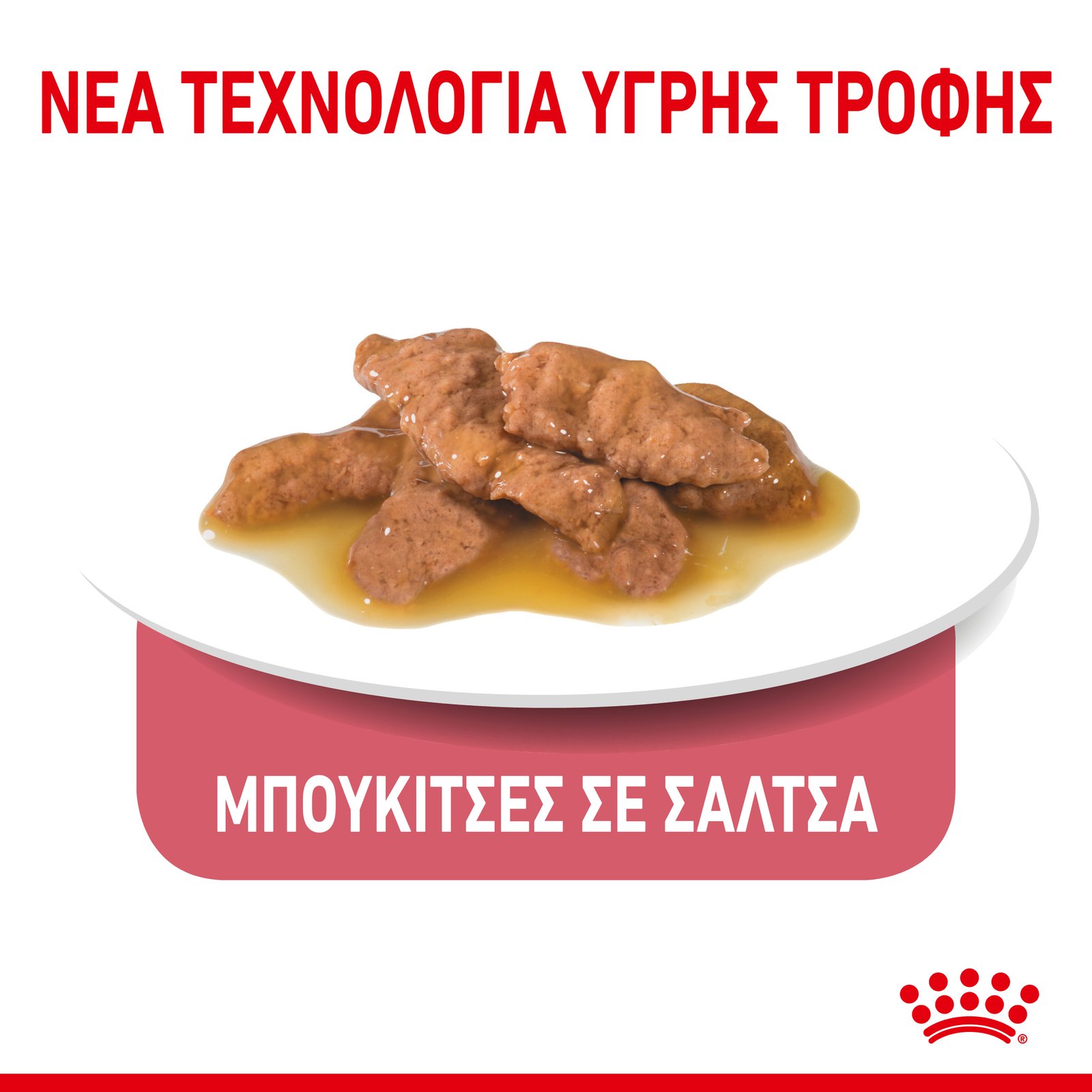 Πλήρης τροφή σε σάλτσα. Κατάλληλη για ενήλικες στειρωμένες γάτες που ζουν μέσα στο σπίτι.