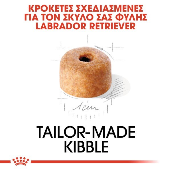 Το σχήμα, μέγεθος, υφή και η φόρμουλα της κροκέτας είναι προσαρμοσμένα στο κουτάβι Labrador Retriever.