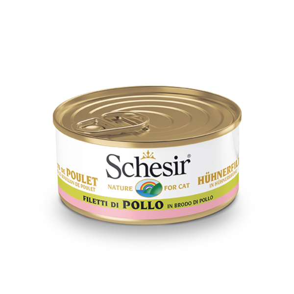Μια συνταγή Schesir βασισμένη σε αληθινά φιλέτα κοτόπουλου, που σερβίρεται σε ζωμό, για γάτες που αγαπούν τη φυσική γεύση και την πιο υγρή σύσταση.